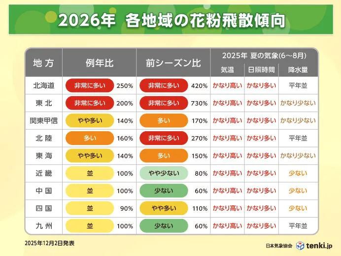 •強風: 強風によって花粉は空高く舞い上がり、広範囲に広がります 全体の飛散量は、東日本と北日本で例年より多く、北日本では例年の2倍以上になる予測です